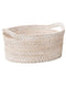 This oval storage basket is made from rattan, featuring a white-toned finish that highlights the warmth and character of natural materials. The integrated handles make it easy to carry, and the design works well as a guest belongings basket or for organising small items around the salon or home.