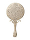 A decorative mirror that can be used as both a hand mirror and a stand mirror.